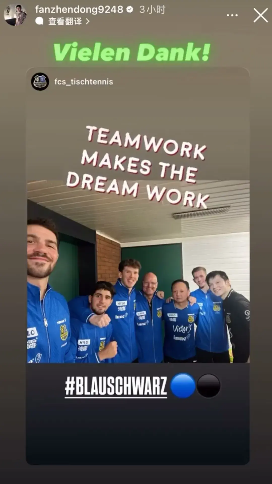 赛后,樊振东向全场球迷挥手并连竖大拇指,听到全场连接不停高呼我方的名字,一只脚仍是跨过告白板的他,再次返场致谢。队长弗朗西斯卡一直陪在樊振东身边,并把舞台交给他,让其全身心享受球迷的祥和,这一举动更是十分暖心。 之后,樊振东也更新了社媒,在球队以“团队衔尾竖立梦思”为主题的大合影顶用德语写下:“十分感谢!(Vielen Dank)”