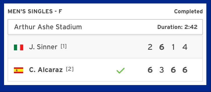 而后,阿尔卡拉斯再次提速并主导了比赛,并以6比1、6比4连下两盘带走告捷。全场比赛,阿尔卡拉斯轰出10记ACE球,42个制胜分比辛纳多出一倍。